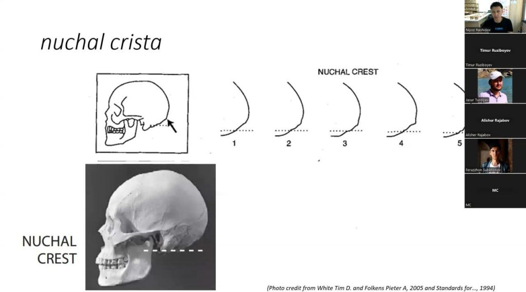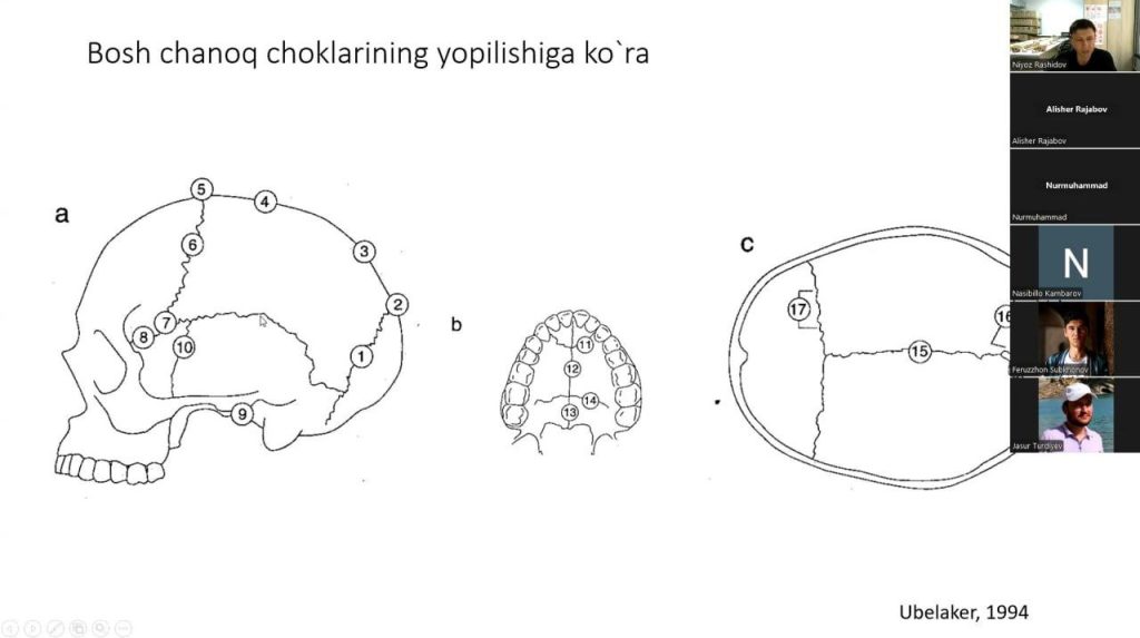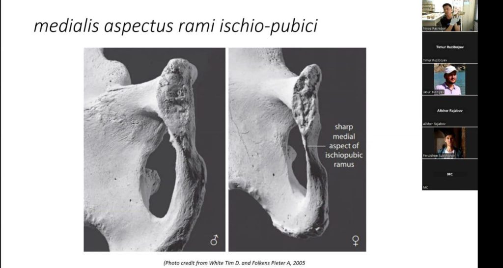 Samarqand Arxeologiya instituti Yosh olimlar kengashining ish rejasiga kora bugun institut kichik ilmiy xodimi Rashidov Niyoz “Inson skeletiga kora jins va yoshni aniqlash metodlari” mavzusida ZOOM platformasi orqali taqdimot qildi. Ma’ruza davomida Arxeologik qazishmalarda qolga kiritilgan inson suyaklarida jins/yoshni aniqlash qanchalik muhimligi, arxeologik va tarixiy xulosalarni olishda ushbu ma’lumotlarning o’rni tushuntirib o’tildi. Skeletda jins va yoshni aniqlashning bir nechta usullari va qoidalari korsatildi. Yosh olimlar va institut yetakchi ilmiy xodimlarining chiqishlari keyingi haftalarda ham davom ettiriladi.